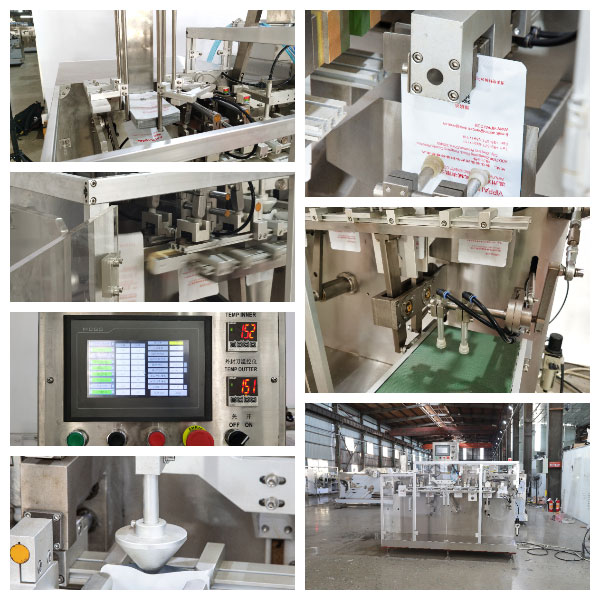 将预制袋装入料斗→机械臂逐袋拣袋→开袋→袋顶侧封口→压印批号→输出