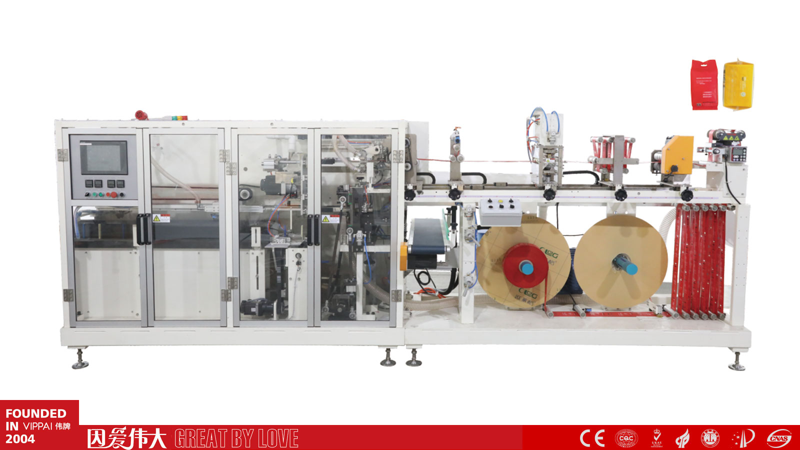 VPD900M智能高速套袋机 根据市场需求特别硏发的智能式套袋机,适用于医疗、化妆品、生活用纸、食品等行业。设备集套袋、包装、封合、打码于一体,绿色环保。设备适用于卫生巾、护垫、宠物垫、棉柔巾、湿巾、尿不湿、手套、口罩、床垫、手术衣、蛋糕、吐司、面包等多种物品包装,可根据客户的产品要求定制