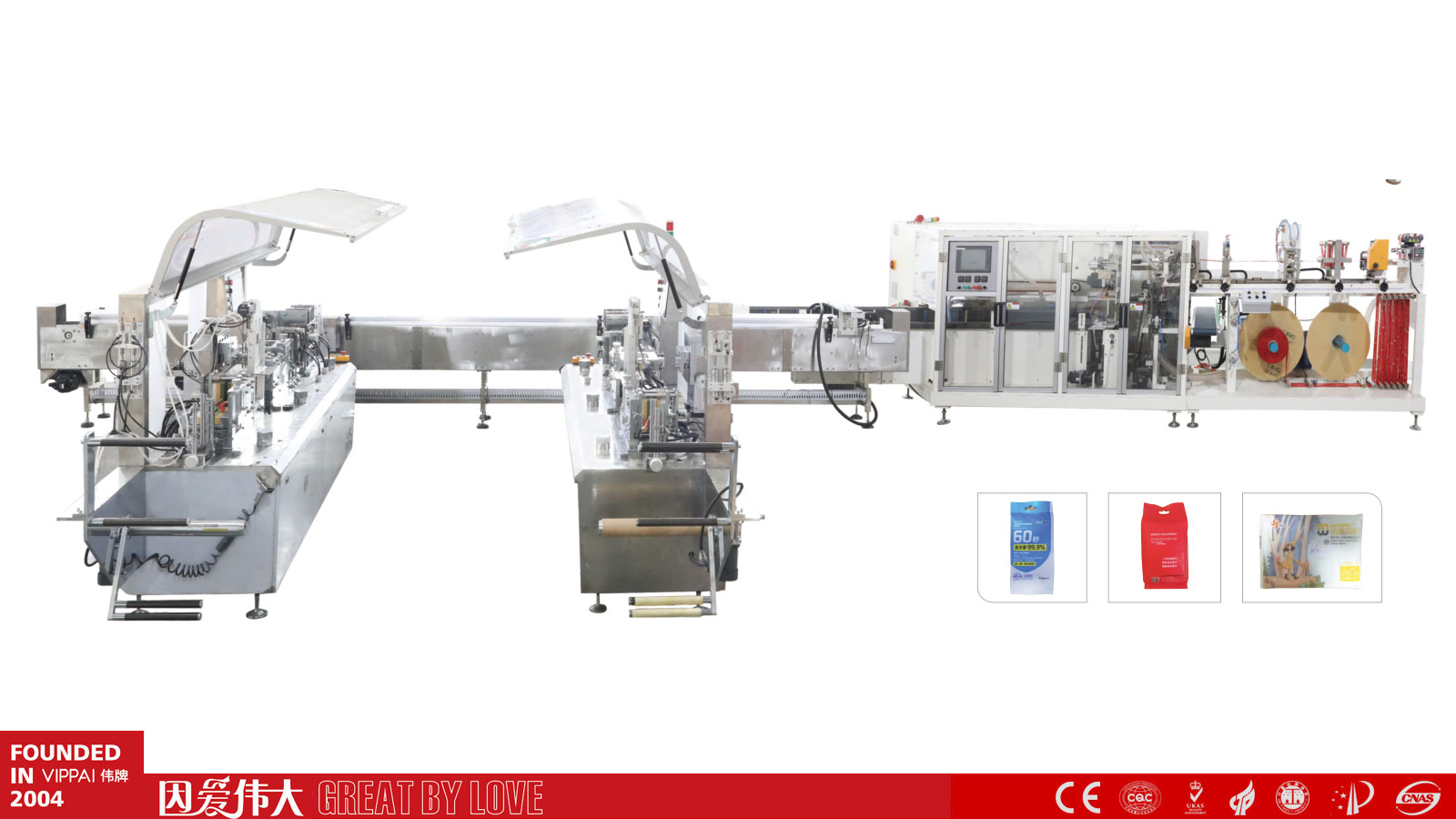 VPD250+VPD900M全自动湿巾套袋机连线 根据客户的要求,设计全自动三亿网页版跟装盒机或套袋机连线